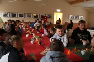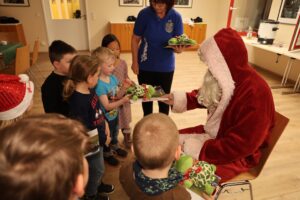 Als die beiden Gruppen wieder vereint waren, schaute sogar mal der Weihnachtsmann vorbei und brachte für jedes Kind eine Kleinigkeit. Zum Schluss gab es natürlich auch noch etwas zu essen. Mit Hotdogs und dem restlichen Kinderpunsch ließen wir die Weihnachtsfeier ausklingen.